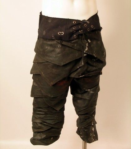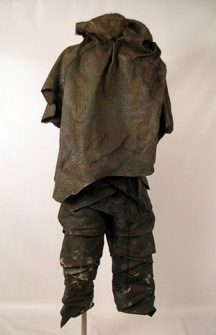 Immortals - King Hyperion (Mickey Rourke) screen worn, brown leather with stitching short cape with hood, overlapped brown and greenish leather with holes and ties around the waist custom heavy pants with built in elastic style shorts, leather belt, and leather with fur and ties custom made boots.