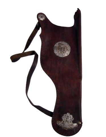 Brown leather with metal design and leather work prototype quiver with strap over the shoulder. (approx. 29" long)