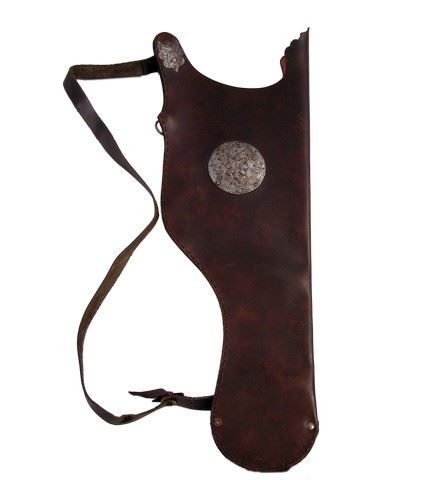 Brown leather with metal design and leather work prototype quiver with strap over the shoulder. (approx. 29" long)