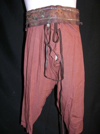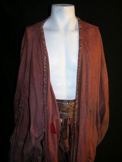 screen worn long burnt orange tie in front cloth robe, disetressed for filming, cloth tie in front pants, leather and faux coin belt.