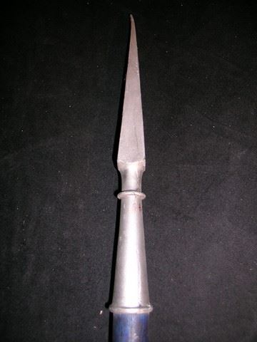 Screen used Hoplite javelin with a dark blue wood shaft and silver rubber tips at each end. (approx. 7' long) Condition may vary slightly.