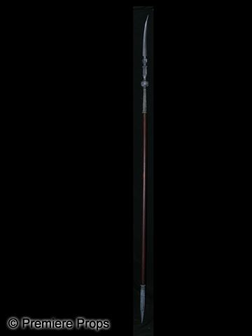 Screen used, brown wood with silver rubber design on the bottom and silver rubber tip long javelin like spear. (approx. 7' long)