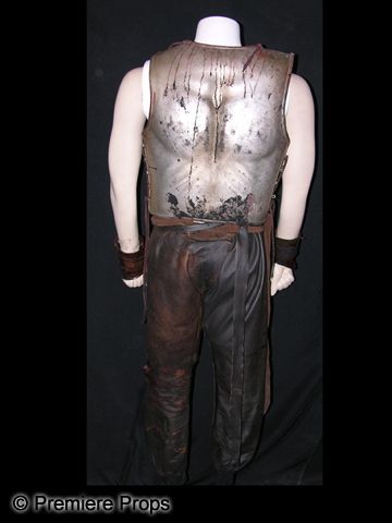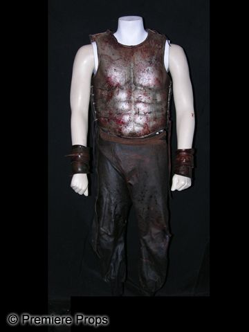 From 2011's 'Immortals.' This is a Stavros (Stephen Dorff) screen worn body armor costume. Wardrobe consists of a hard plastic and leather custom made, silver painted chest and back plate with leather lacing on the side and stained with stage blood and dirt, a pair of painted silver velcro cuffs, stained with stage blood, and a pair of dark brown leather pants with tears, lacing on the waist, and stage blood stains.