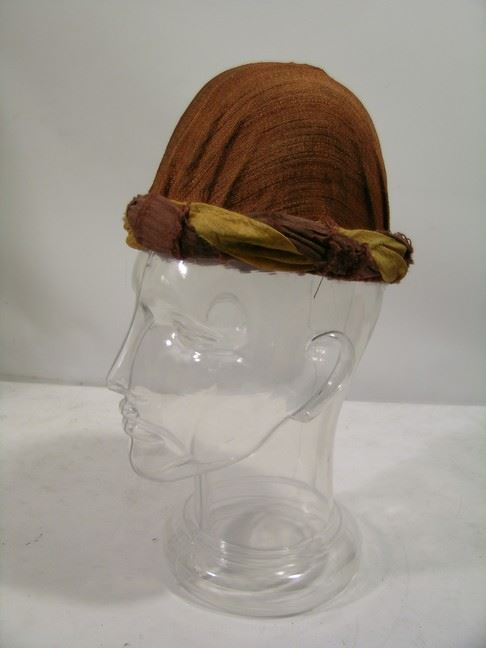 Villager's screen worn, red cloth over woven design with fabric at the bottom custom made hat.