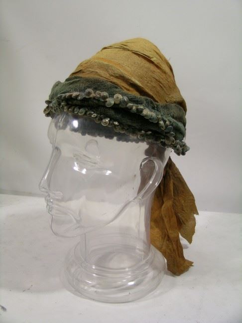 Villager's screen worn, gold and purple cloth with shell design custom made hat.
