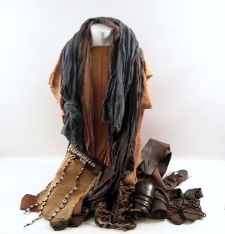 Villager's screen worn, hero, multi color, cloth, leather and rope wardrobe pieces and two pairs of sandals. (note: photo will not match costume exactly but is a mixture of similar pieces of wardrobe)