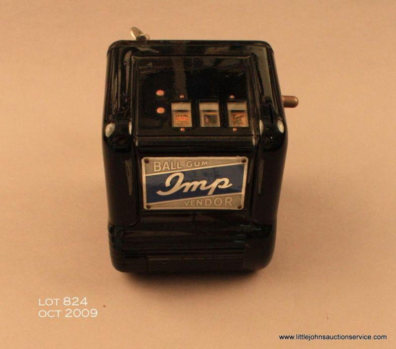 Imp-penny operated gum-ball dispenser circa 1920-1930 in fine to excellent condition. Worked like slot machine and reels showed cigarette packs. Often used on bar-tops and for gambling purposes. Est. $200 - $400