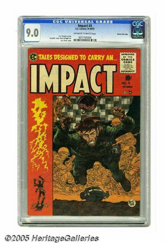 <B>Impact #4 Gaines File pedigree (EC, 1955) CGC VF/NM 9.0 Off-white to white pages.</B></I> Jack Davis cover. Jack Davis, Graham Ingels, Reed Crandall, and George Evans art. <I>While CGC has certified this issue as a Gaines File copy, no certificate accompanies this lot</B></I>. Overstreet 2005 VF/NM 9.0 value = $93; NM- 9.2 value = $125. CGC census 7/05: 4 in 9.0, 3 higher.
