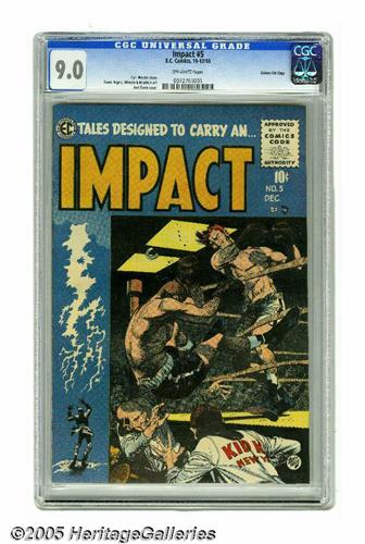 <B>Impact #5 Gaines File pedigree (EC, 1955) CGC VF/NM 9.0 Off-white pages.</B></I> This last issue of the title features an outstanding Jack Davis cover that packs a punch. With art by George Evans, Graham Ingels, and Bernard Krigstein, this comic goes far beyond mere "classic" status. Overstreet 2005 VF/NM 9.0 value = $93; NM- 9.2 value = $125. While CGC has certified this issue as a Gaines File copy, no certificate accompanies this lot. CGC census 7/05: 2 in 9.0, 5 higher.