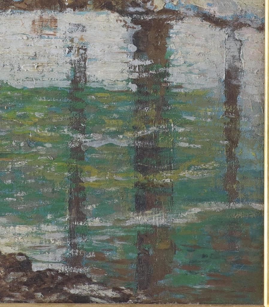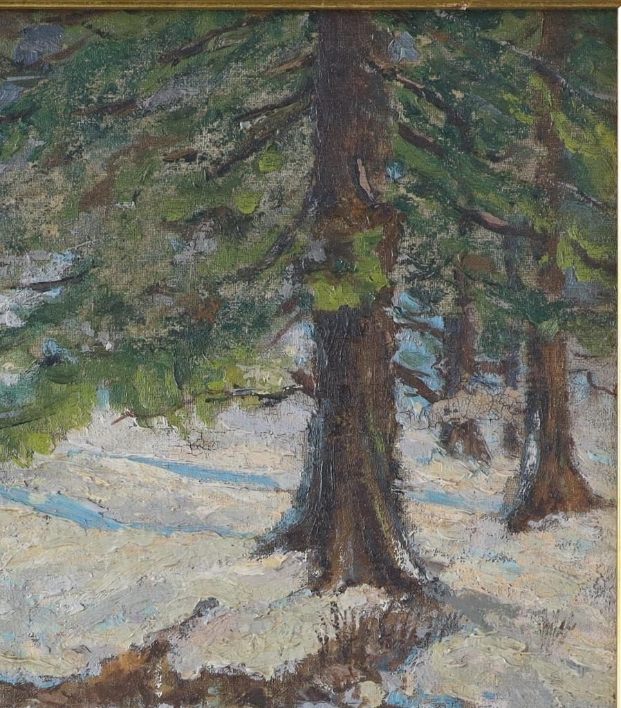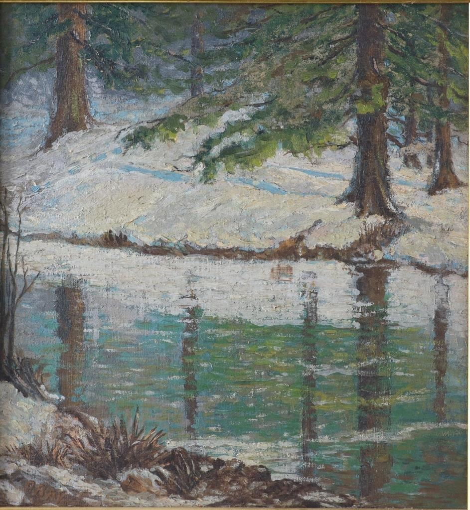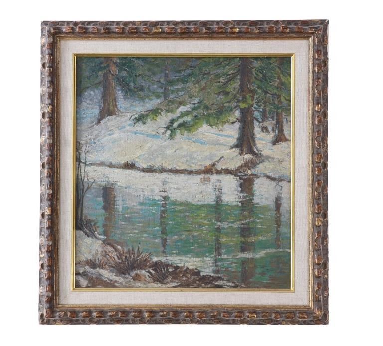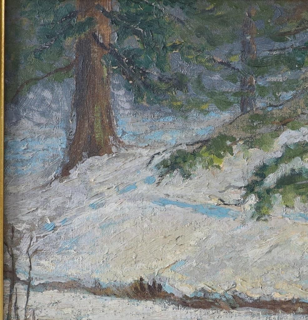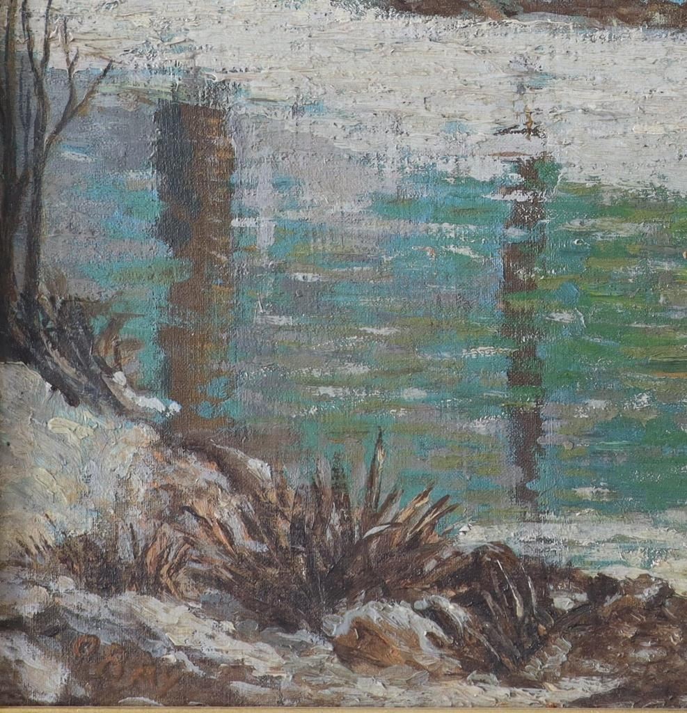 Offered in this lot is a Signed Original Impasto Landscape Oil on Board Painting, artist's signature is on the bottom right corner of the painting, Obay. The wintery scene shows a snow covered forest floor, fir trees, their bright green needles devoid of snow, possibly the first snow of the season. A small creek or pond in the foreground reflecting the snow covered ground and trees, not yet caught up in the hard freeze of winter.
