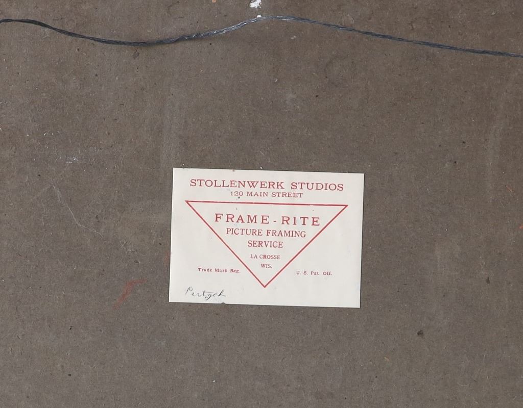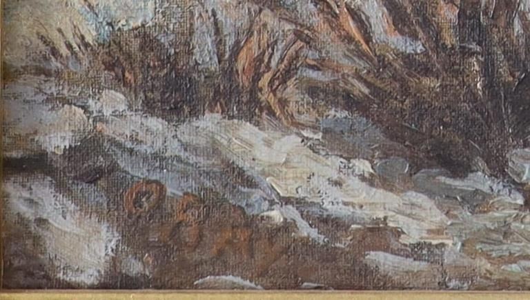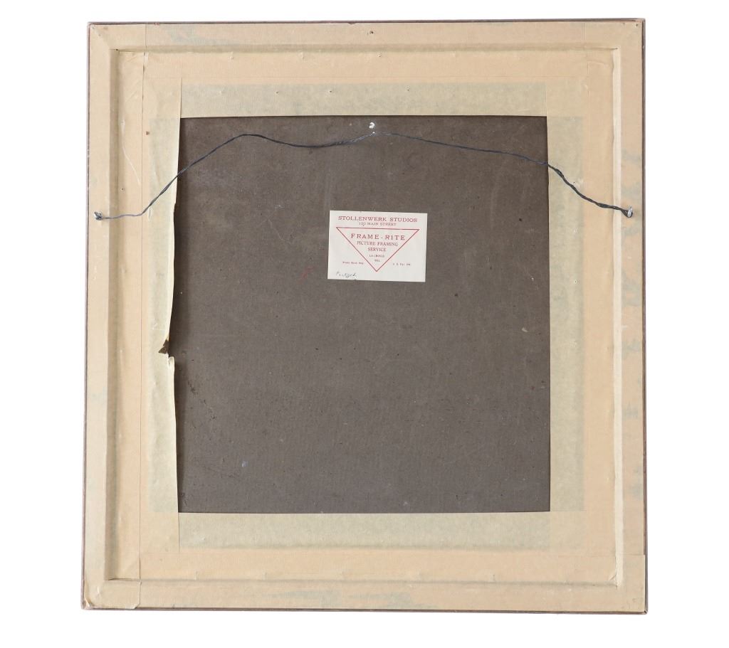 This painting is in very good condition, no marring noted. The gold gilt trimmed wood frame is in good overall condition, scuffing noted to the edges, no other obvious marring noted. Visible art measures 15"W x 16"L; frame is 20"W x 21"L