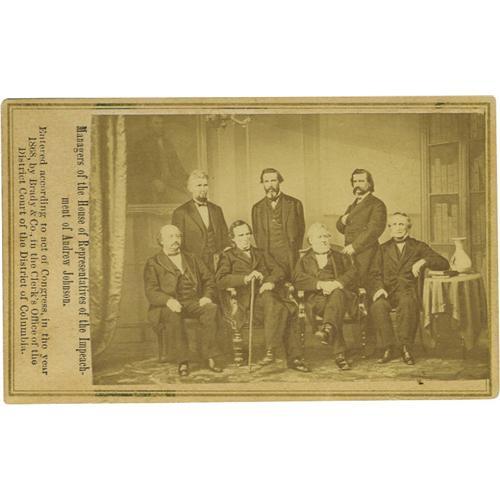 <B>Impeachment of Andrew Johnson - House of Representatives Managers <I>Carte de Visite</B></I>.</B></I> Andrew Johnson was the first and last President to be impeached; however, he was acquitted by a single vote in the Senate. Essentially the power struggle and politics surrounding the impeachment trial are many and varied; in short, Johnson violated the "Tenure of Office Act" when he removed Edwin M. Stanton from office. This CDV features members of the House of Representatives, who served as managers during the hearing to impeach the President. Pictured are some familiar faces: Benjamin Butler, Thaddeus Stevens, John Bingham, George Boutwell, John Logan, Thomas Williams, and James Wilson. Bears the M.B. Brady imprint on the verso. In very fine condition; light overall toning; image still very crisp and clean; pencil notations on verso; double lined gilt border; square corners.<BR><BR><b>Shipping:</b> Small Flat (<a target="_blank" href="http://www.heritageauctions.com/common/shipping.php">view shipping information</a>)