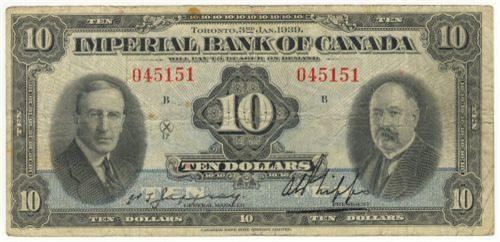 Imperial Bank of Canada $10.00 note 1939 in Very-Fine, 375-24-02, serial 045151.