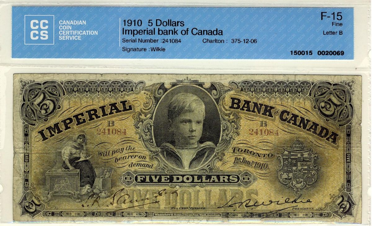 Imperial Bank of Canada, 1910 $5 #241084, CH375-12-06, CCCS F15. Best example seen by TCNC, rare and underrated.