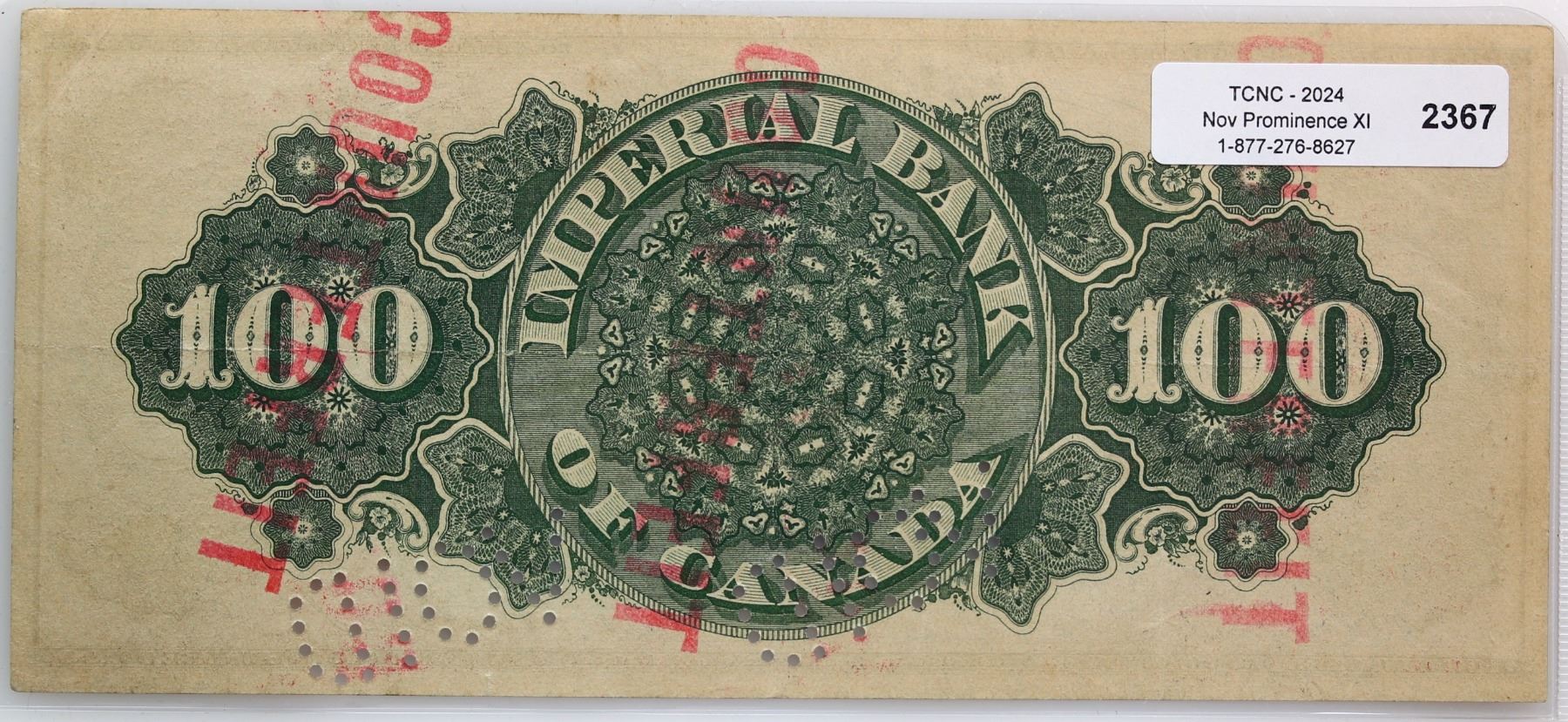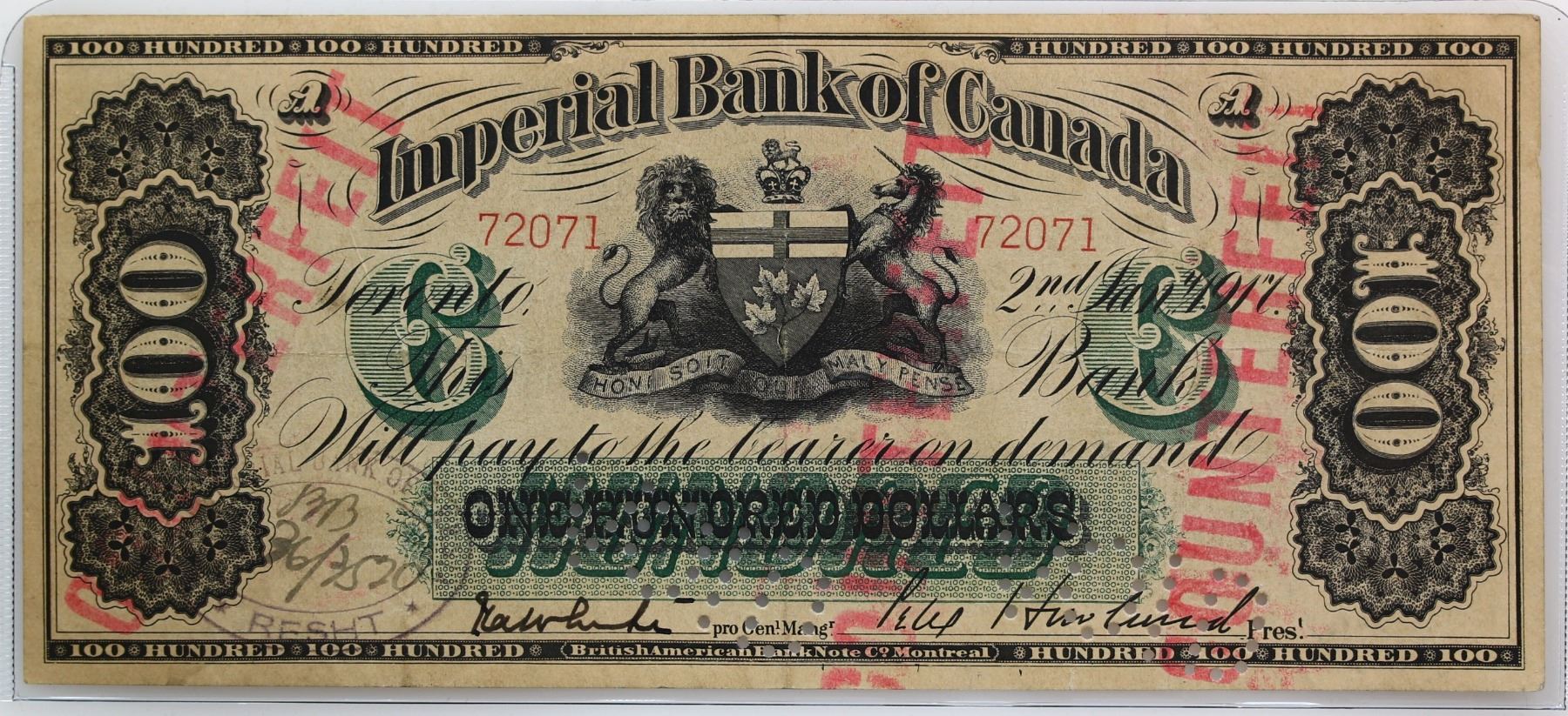 Imperial Bank of Canada; 1917 $100 Counterfeit CH-375-16-24C #72071, Perforated cancelled. Ef example.
