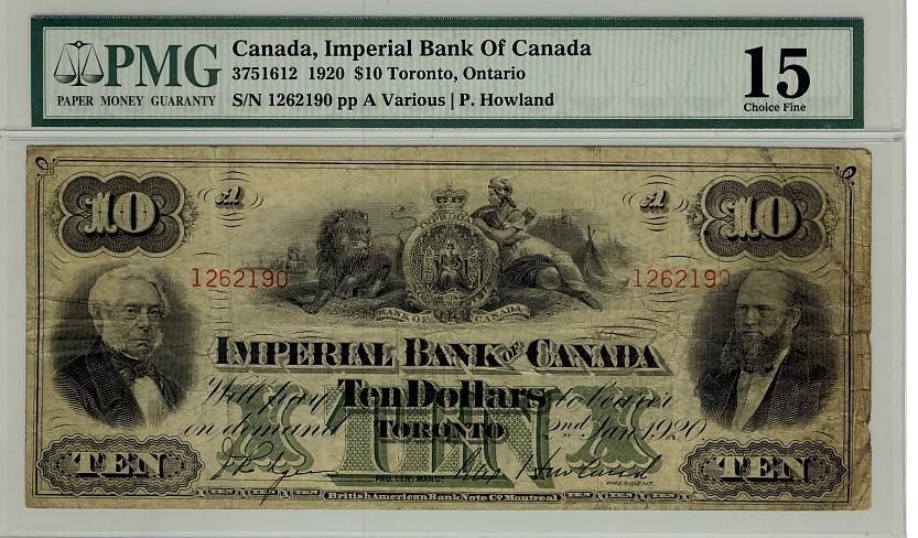 Imperial Bank of Canada, 1920 $10 #1262190, CH-375-16-12, PMG F15