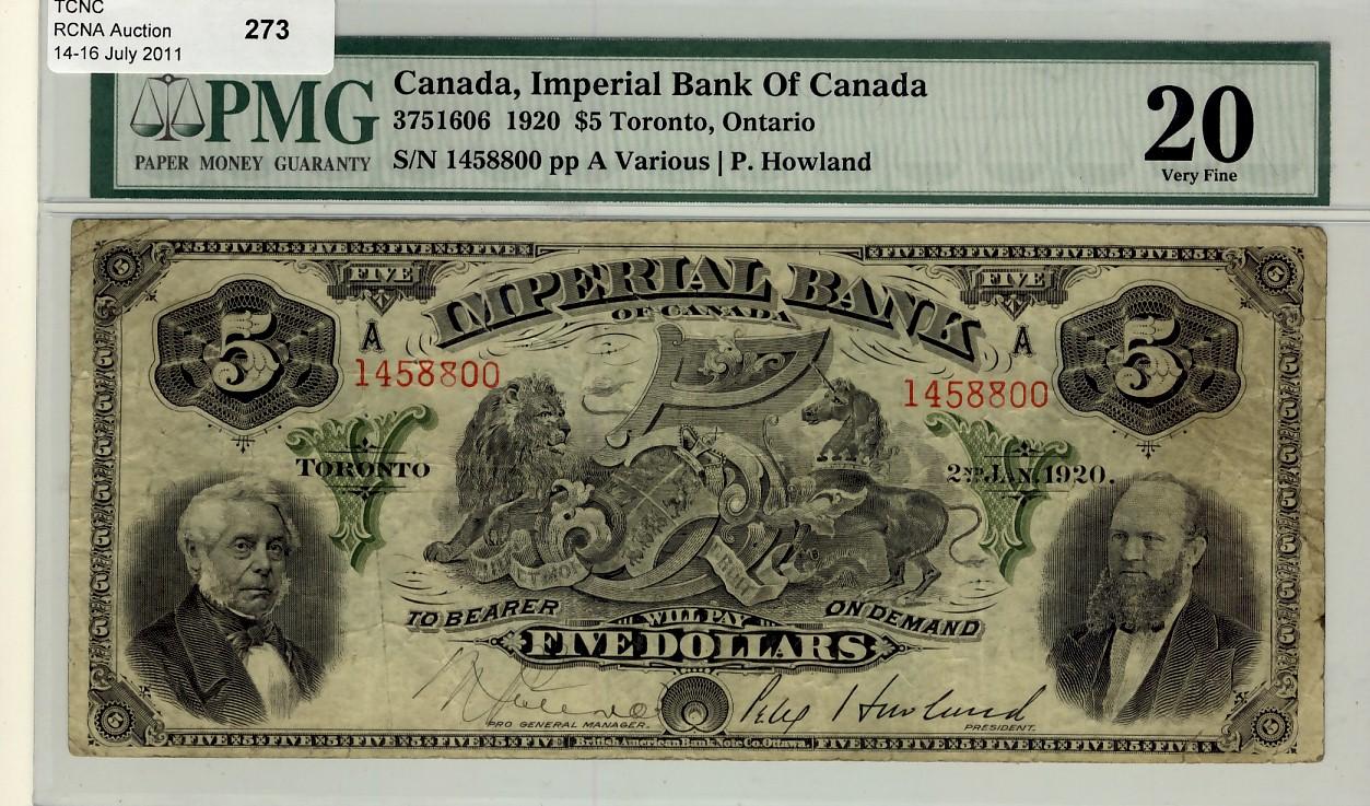 Imperial Bank of Canada 1920 $5 1458800 CH-375-16-06 PMG VF20