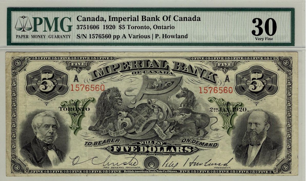 Imperial Bank of Canada 1920 $5 #1576560, CH-375-16-06, PMG VF30. Best example graded by PMG.