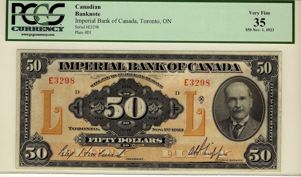 Imperial Bank of Canada, 1923 $50 #E3298, CH-375-18-14, PCGS VF35. Second best example graded by PMG.