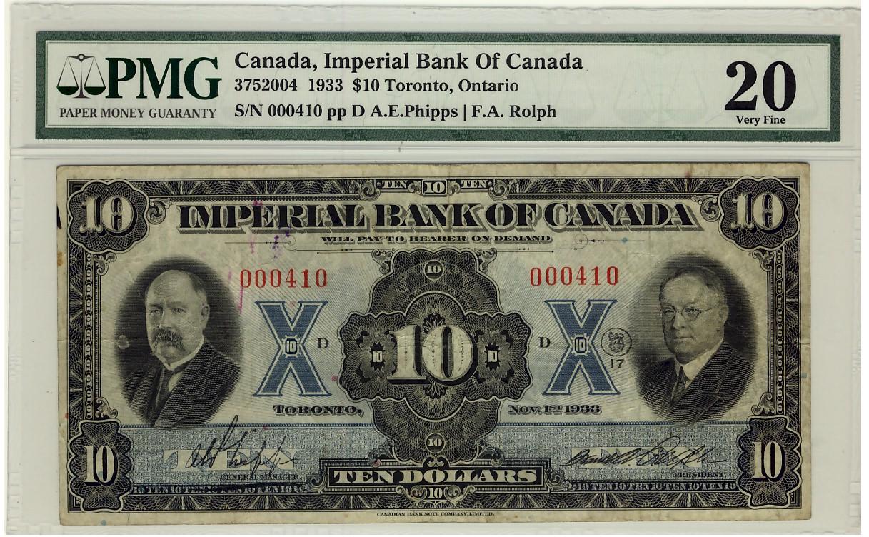 Imperial Bank of Canada 1933 $10 #000410 CH-375-20-04 PMG VF20