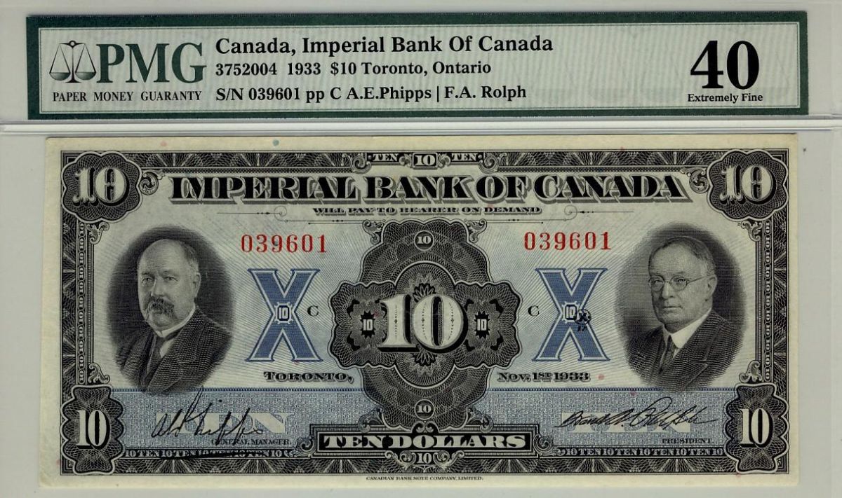 Imperial Bank of Canada: 1933 $10 #039601,CH-375-20-04 PMG EF40. Bright and crisp. Looks choice. Tied for finest graded.