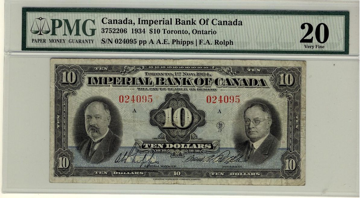 Imperial Bank of Canada 1934 $10 #024095, CH-375-22-06, PMG VF20,