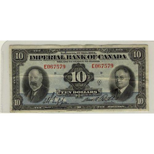 Imperial Bank of Canada, 1934 $10, CH-375-22-06. A nice example in VF condition.