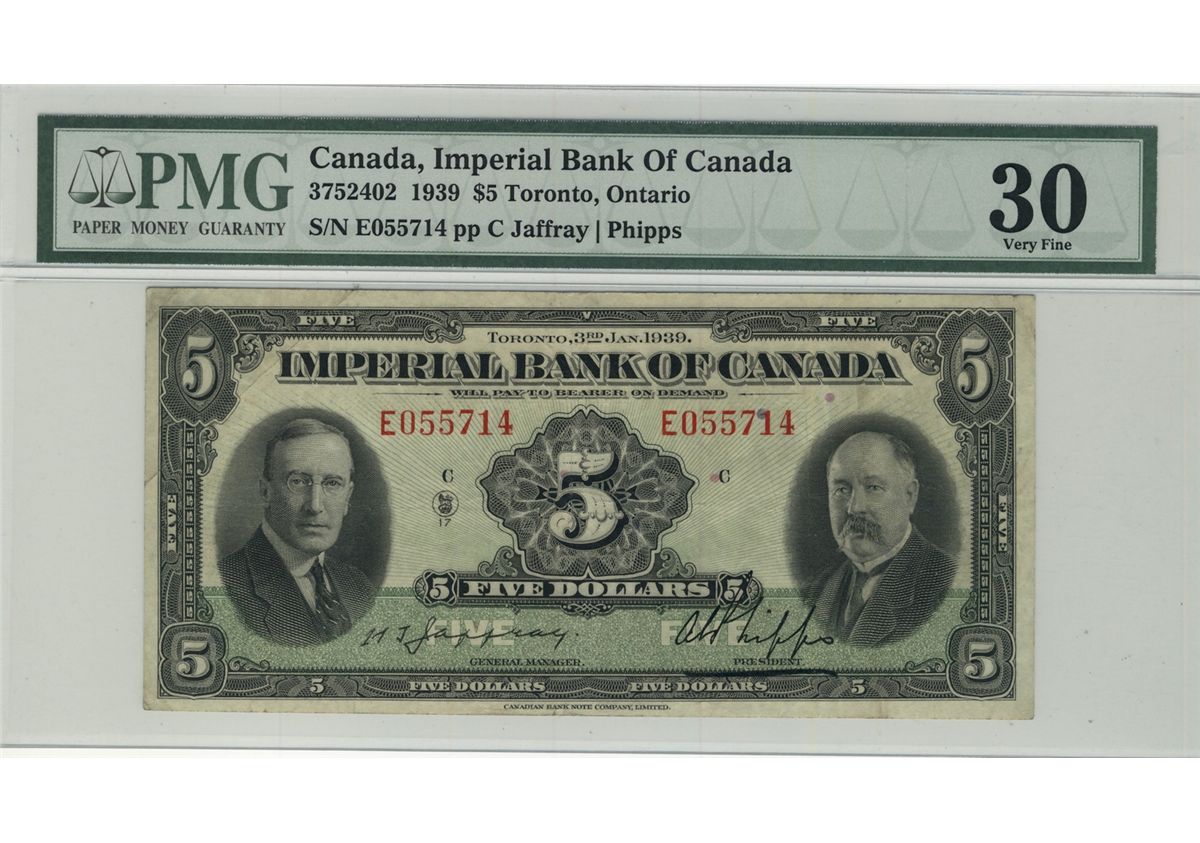 Imperial Bank of Canada; 1939 $5 #E055714 CH-375-24-02 PMG VF30.
