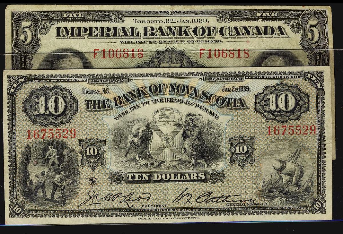 Imperial Bank of Canada 1939 $5 #F106818 CH-375-24-02 and the Bank of Nova Scotia $10 #1675529 CH-550-36-04. Lot of 2 notes Fine to VF.