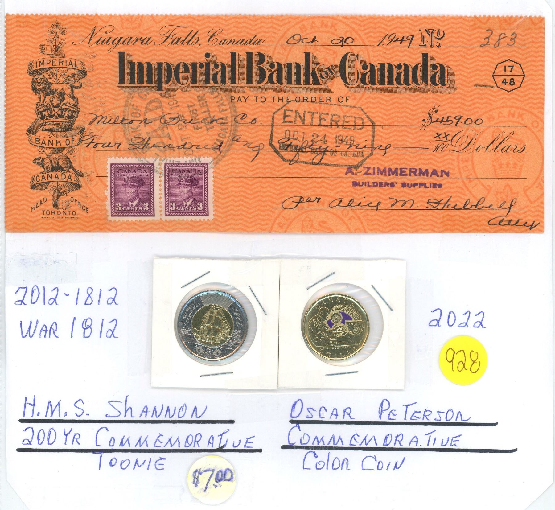 Imperial Bank of Canada Cheque Receipt and 2012 "HMS Shannon" Toonie, 2022 "Oscar Peterson" Color Loonie