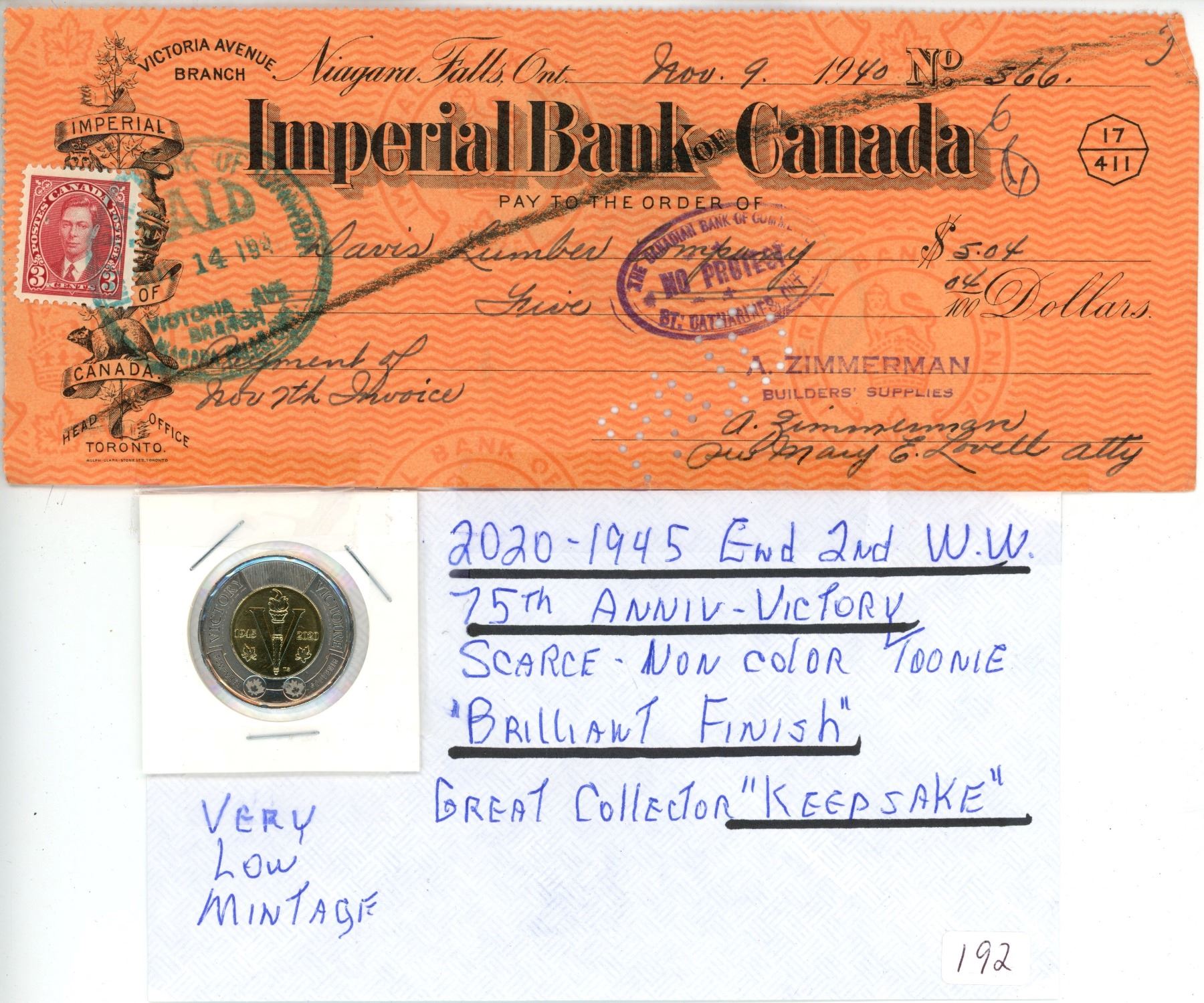 Imperial Bank of Canada Cheque Receipt and 2020 75th Anniversary of W.W.II Noncolored Toonie