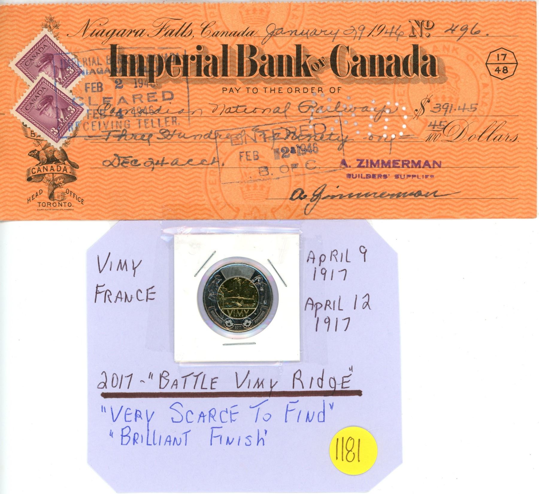 Imperial Bank of Canada cancelled cheque stamped February 1946 and commemorative 'Vimy Ridge' 2017 toonie