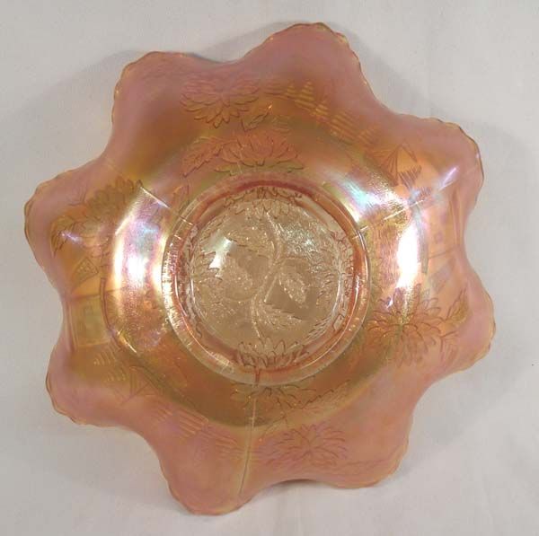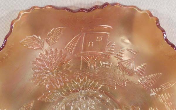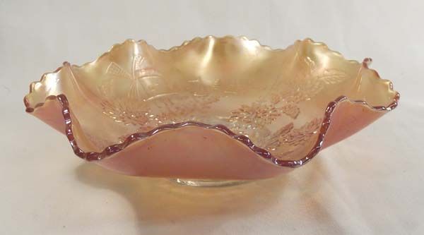 Imperial Carnival Glass-''Double Windmill'' Marigold. Beautifully ruffled footed dish in the collectible pattern, ''Double Windmill'', iridescent marigold glass. Measures 8'' diameter, 2'' high. The condition is excellent.