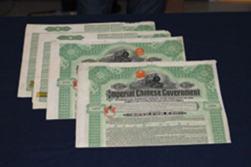 China, 1911, 20 Sterling, 5% Hukuang Railways Sinking Fund Gold Loan, I/U bond, #'s 10165, 10164, 11876, 29944, Black on green border and underprint, Moving locomotive top center l-r, Coupons attached, Fine condition lot with some splitting and taping up of coupons which are stapled to the bond. These bonds are countersigned by Deutsch-Asiatische Bank. On two of the bonds there are Blue TFEL-2 forms #965203 and 965202 with a portrait of Marshall. Form was proof that holder of the bond was not an enemy of the State. Accompanying these bonds is a map of “Chinese Railways “ financed with foreign bonds 1876-1938 in color and VF condition.
