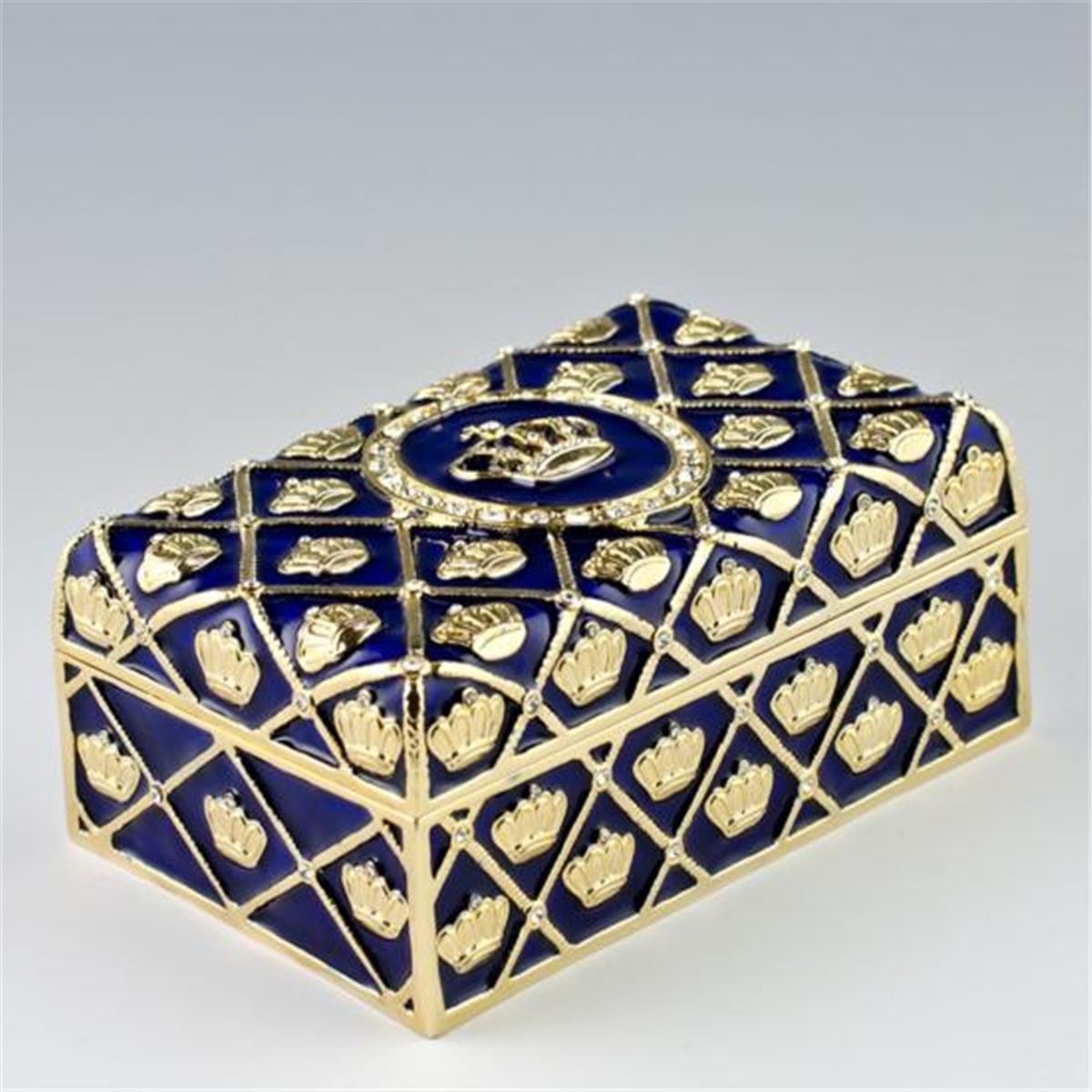Imperial Crown Faberge Presentation Box, Dimensions: 3.75in (L) X 2.5in (W) 1.5in (H), Weight: 15.5 oz, Material: Pewter, Crystals, Enamel. This box has blue translucent enamel under the crystal ornamentations in the form of crosses. Faberges superb enameling technique is regarded as one of his main contributions to art at the end of the last century. These wave (moire) designs are a common type of guilloche work on enameled articles by Faberge.