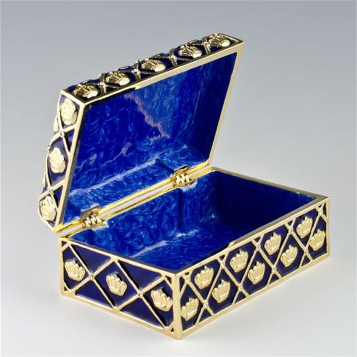 Imperial Crown Faberge Presentation Box, Dimensions: 3.75in (L) X 2.5in (W) 1.5in (H), Weight: 15.5 oz, Material: Pewter, Crystals, Enamel. This box has blue translucent enamel under the crystal ornamentations in the form of crosses. Faberges superb enameling technique is regarded as one of his main contributions to art at the end of the last century. These wave (moire) designs are a common type of guilloche work on enameled articles by Faberge.