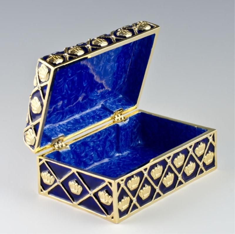 This box has blue translucent enamel under the crystal ornamentations in the form of crosses. Faberge?s superb enameling technique is regarded as one of his main contributions to art at the end of the last century. These wave (moir?) designs are a common type of guilloche work on enameled articles by Faberge. The inside of the box is covered with blue enamel. The royal glossy blue in the inside makes this box the perfect jewelry storage place! 3.75'' (L) X 2.5'' (W) X 1.5" (H) 15.5 oz Pewter, Crystals, Enamel