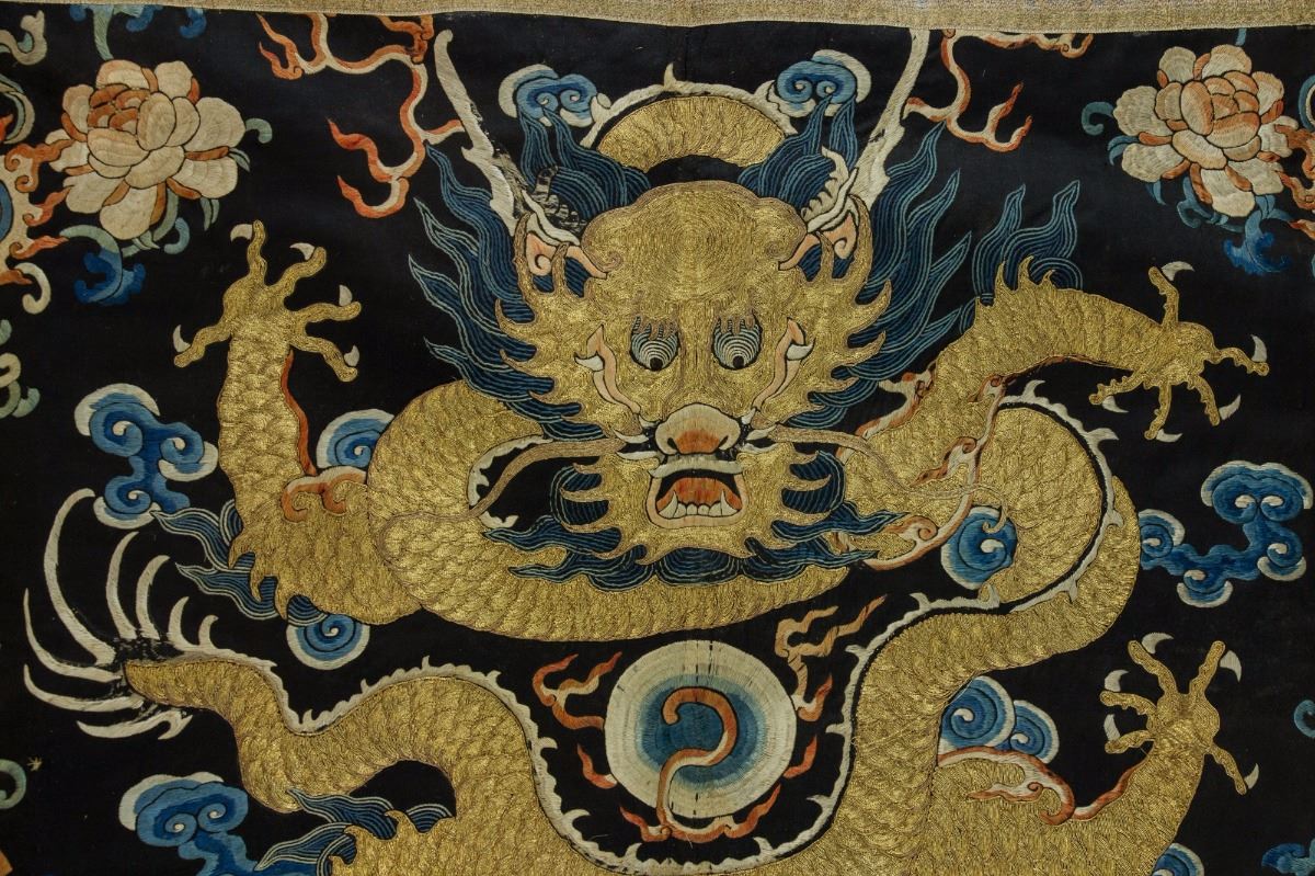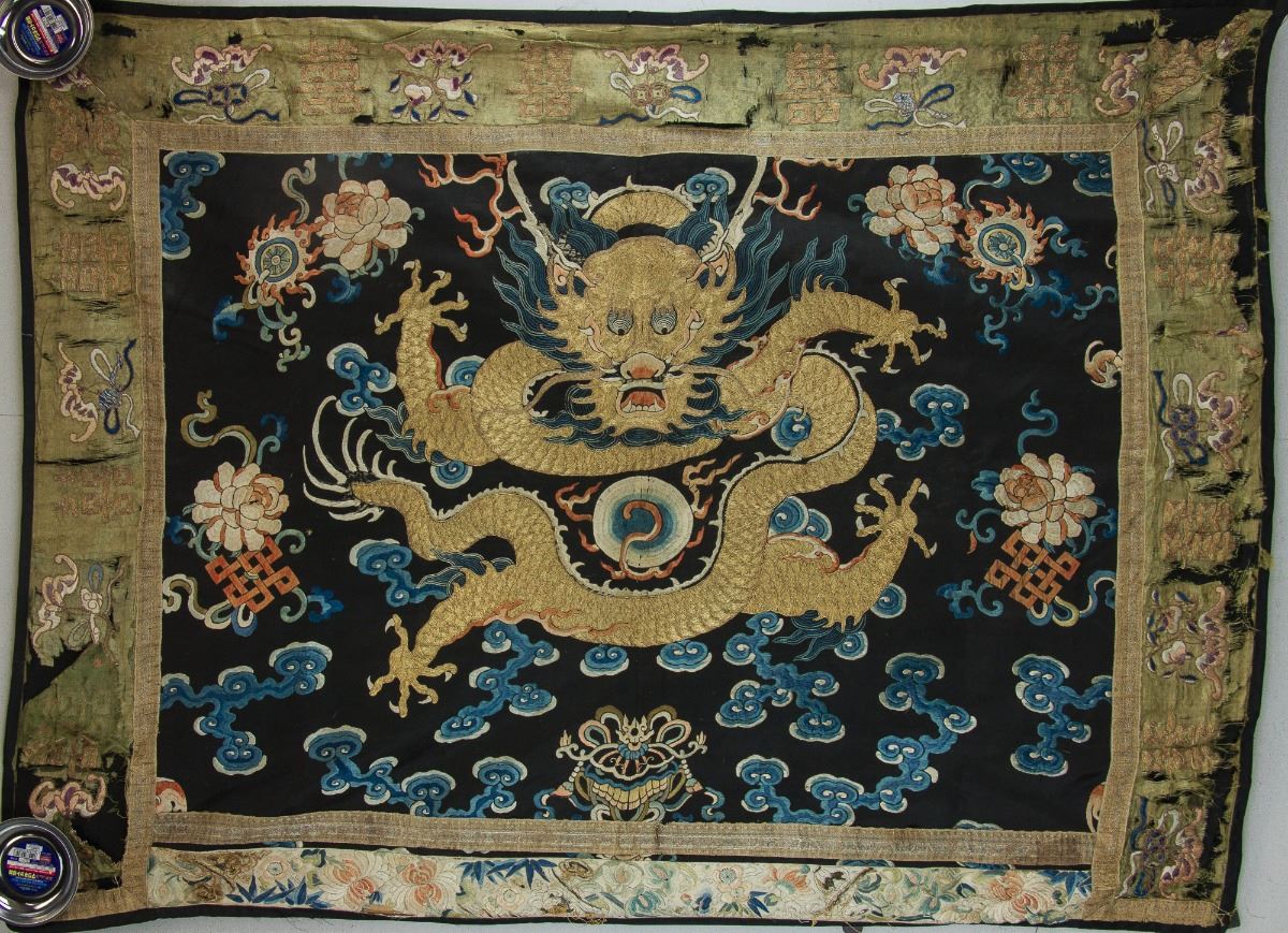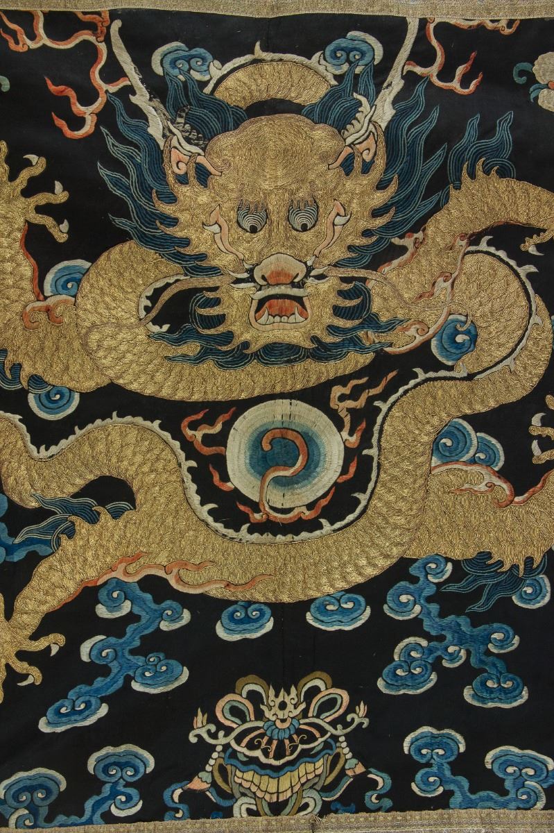 Imperial dragon wool panel; with embroidery of dragon in the middle, decorated with fire ball, cloud and auspicious patterns; 18th Century; 119 cm × 92 cm, 544 grams