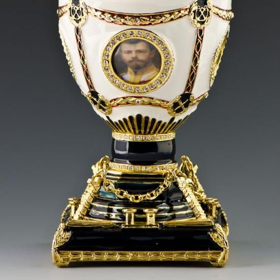 Imperial Eagle Faberge Style Egg, Dimensions: 8.5in (H), Material: Pewter, Enamel, Crystals. The famed Faberge eggs are jeweled eggs, often with the most ornate, minuscule designs on them.The famed Faberge eggs are jeweled eggs, often with the most ornate, minuscule designs on them. The House of Faberge made the original pieces from 1885 to 1917. At that time, they became popular gifts given during the Easter season. Larger versions were made for the Russian royal family, including Alexander III and Nicolas II. Of these, 42 of the 50 originals exist today. Most Faberge eggs, though, were much smaller and hung from a chain around the neck. These eggs have precious metals on them or gemstone decorations, often with intricate detailing. These are a symbol of luxury and thought of as individual masterpieces.