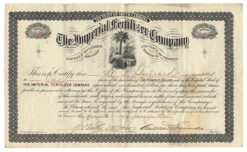 1894, South Carolina. Stock for 1 share. Black. Top center vignette of supplies and a palm tree. Some light staining. Uncancelled and fine.