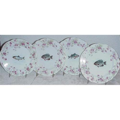 Four fish plates, Imperial Crown China, Austria. 8 1/2" in diameter. One dish is chipped.