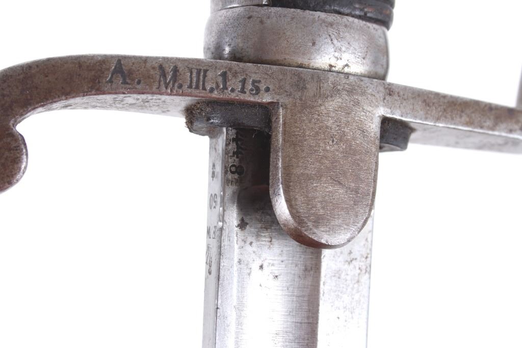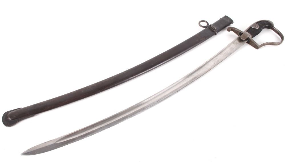 Featured in this lot is this Imperial German light artillery officer's sword circa 1880's. The sword features a wonderfully and professionally crafted steel full tang blade with a steel cross guard and hilt with wrapped leather. The hilt is marked 'A. M. III.1.15'; and the blade is marked at the base '448'; and the sheath is marked '19.RSA.8.61.' The condition of this light artillery sword is good with heavy patina adorning the pommel and cross gaurd and hilt of the sword while showing very minor oxidation to the blade of the sword but otherwise shows good overall condition. The measurements of this sword in its sheath is 36 1/2" x 6" x 1 1/4" and the blade length is 29 1/2".