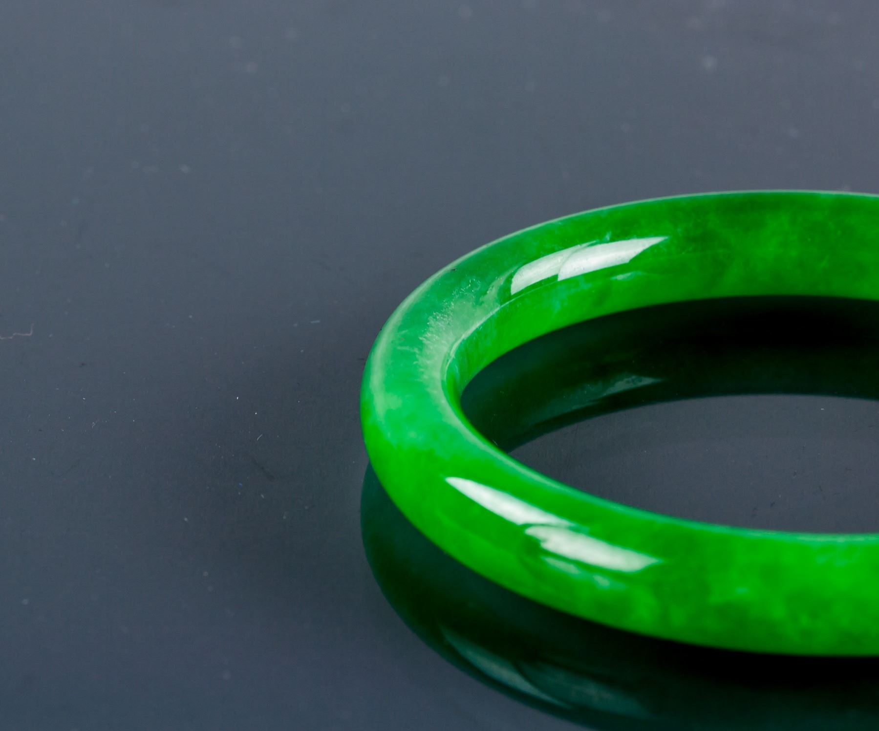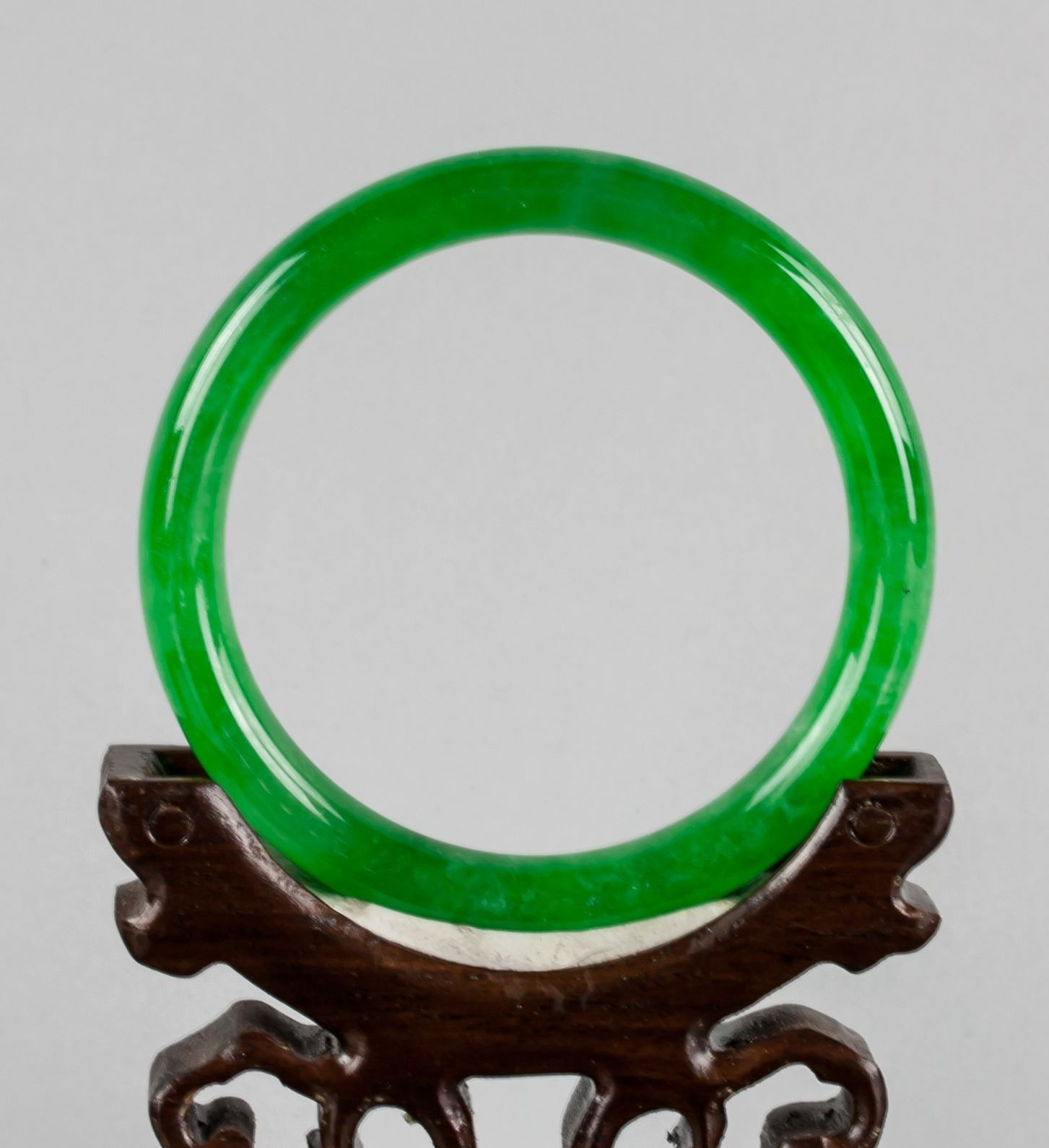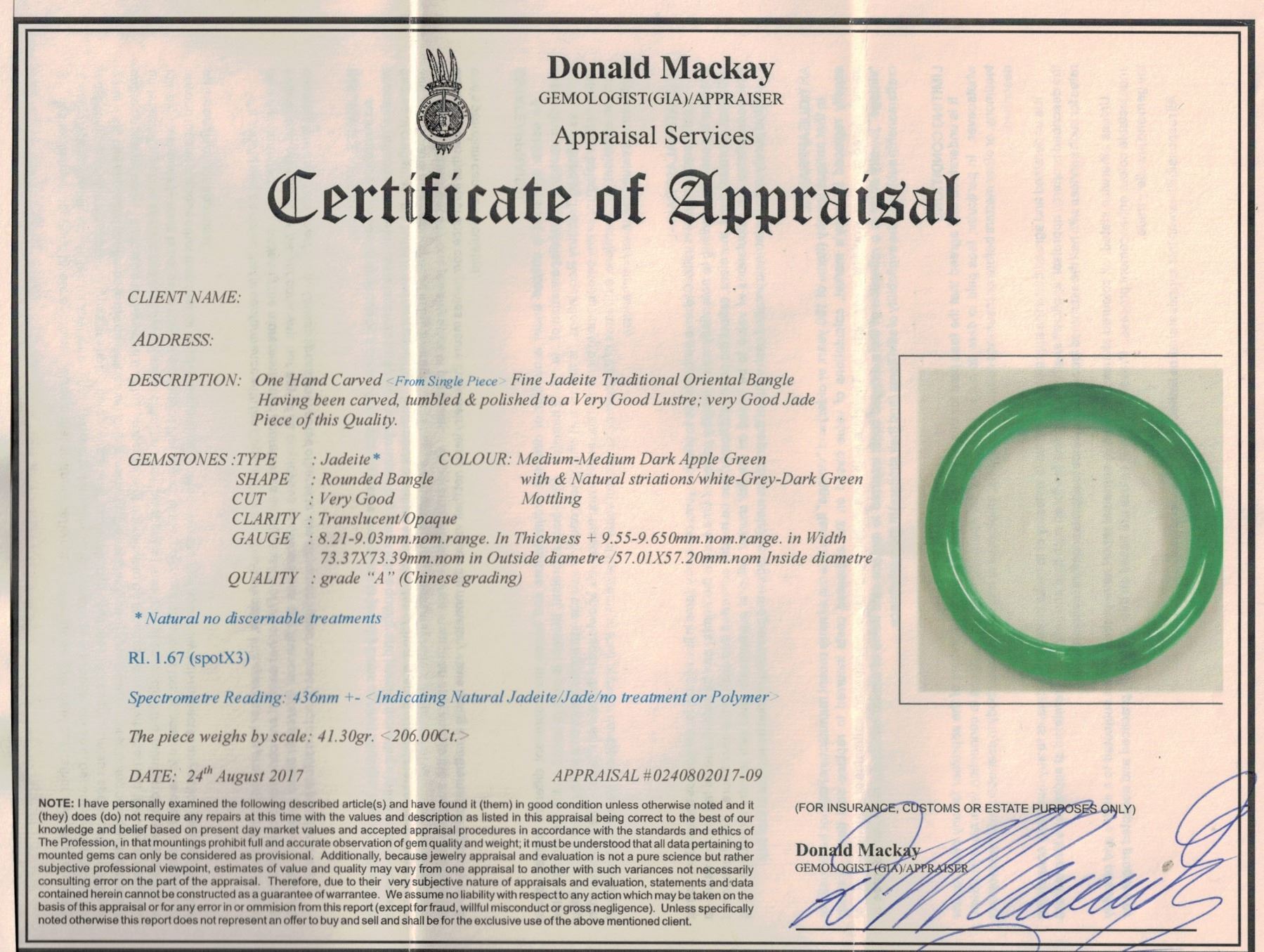 Hand carved very fine Imperial Burma green jadeite bangle; accompanied with appraisal certificate numbered 0240802017-09, dated 24 August 2017, of medium-medium dark apple green tone with natural striations and white, grey, and dark green mottling; no indications of impregnation, treatment, or polymer with spectrometer reading of 436 nm indicating natural jadeite, “A Jade”; tumbled and polished to a very good luster; Inner Diameter: 5.7 cm, Thickness: 0.9 cm, 41 grams, Density: 3.33