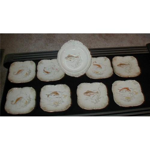 Great Imperial, Bonn Germany, Hand Painted porcelain Fish set. It includes a large bowl 10.5Lx11W. The 8 plates are 8.5Lx8.W and several are signed and numbered. Some are signed Imperial. there are different fish and undersea flora on plates. Due to age there is some crazing on the backs of a few plates and the bowl and a plate have a 2" stress crack which are not serious and not very noticeable. Buyer pays shipping and handling costs.