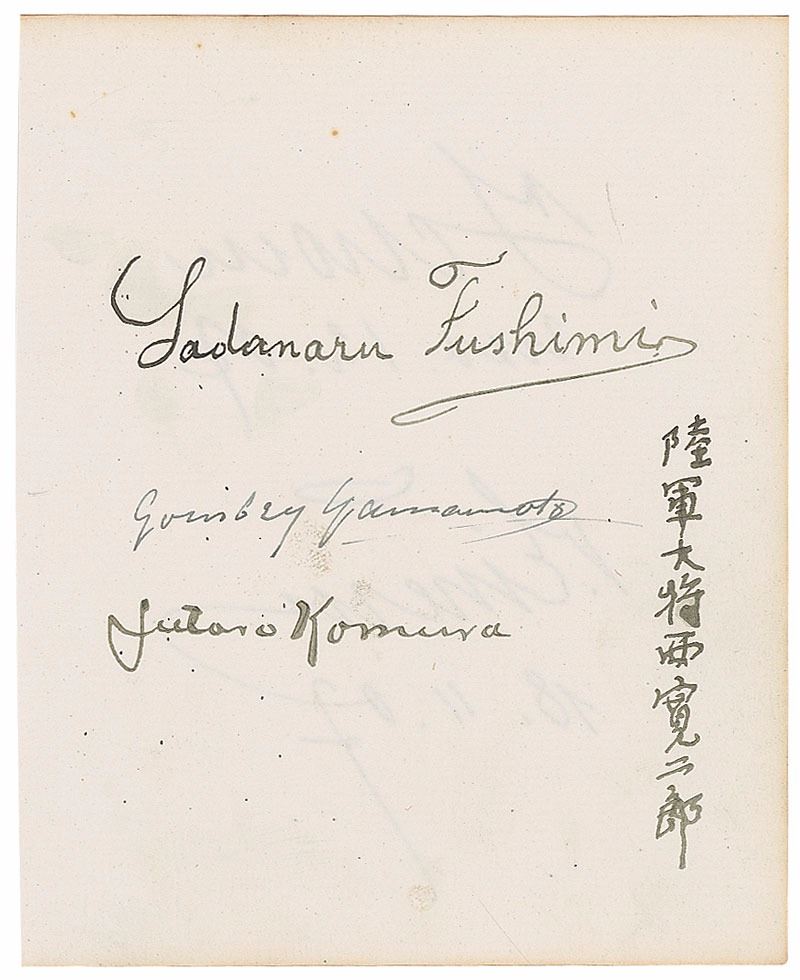Rare ink signatures of field marshal Prince Fushimi Sadanaru, admiral and future prime minister Yamamoto Gonnohyoe, and statesman Komura Jutaro on an off-white 4.75 x 5.75 album page. In fine condition.