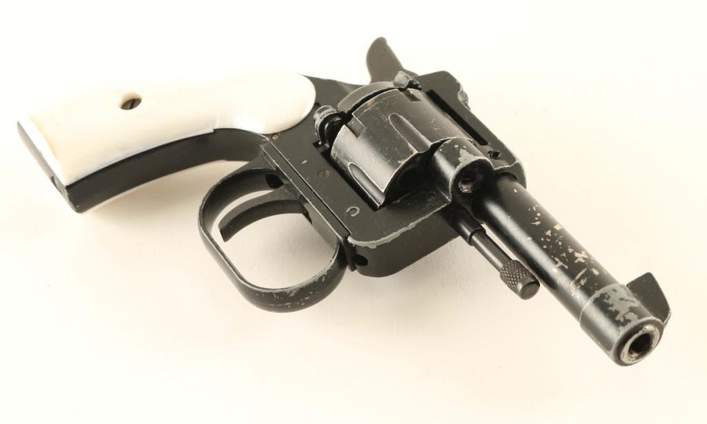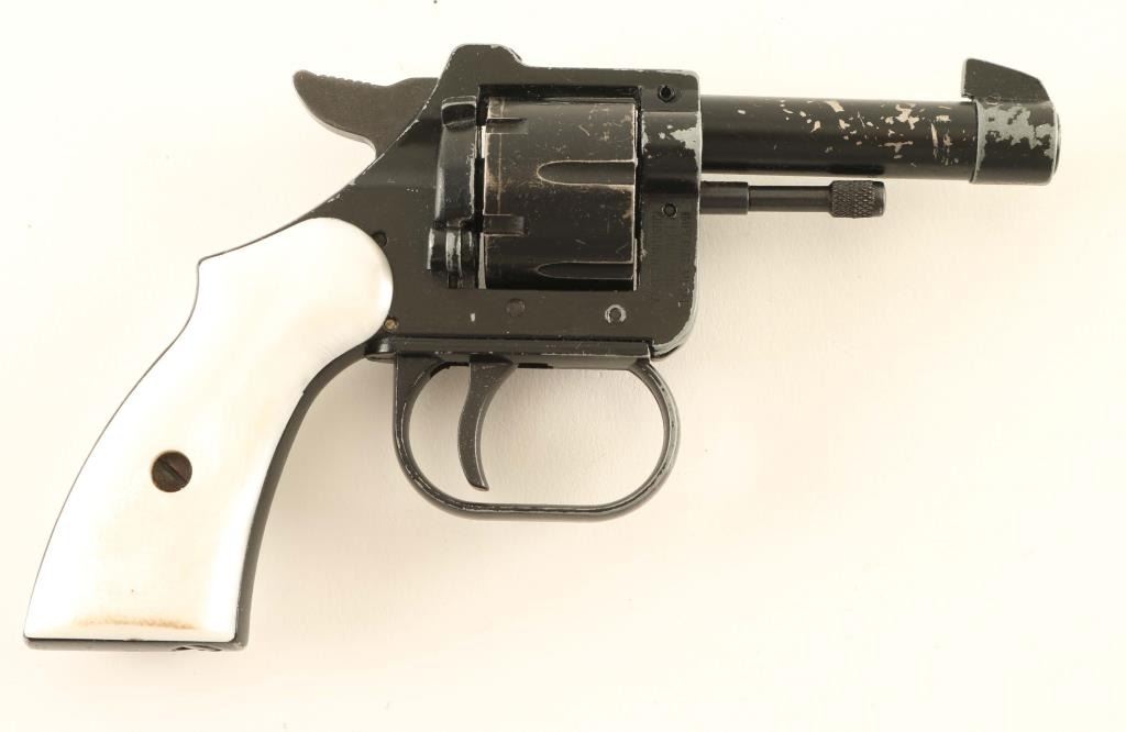 Inexpensive small frame double-action revolver chambered in .22 Short. Features a black finish, 2.5" round barrel, full-banded blade front sight, square notched rear sight, smooth trigger, serrated hammer spur, fluted six-shot cylinder, pivoting loading gate, manual ejector rod, alloy frame and smooth two-piece faux mother-of-pearl grips. Revolver retains approximately 70% of its black finish showing edge wear and scattered losses. Action performs well in single action mode but the trigger fails to return under its own power for a double action pull, the lock-up is solid, the bore is very good and synthetic grips are good with what appear to be tooling marks from a vice. Condition is NRA Fair to Good. ***Modern Firearm***
