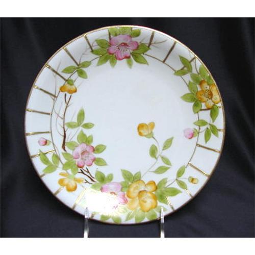 Imperial Nippon 9-3/4" handpainted floral plate. Lovely pink and yellow flowers entwined betwen a gold trellis along the rim of the plate. The paint is in excellent condition, no loss of gold or beading.