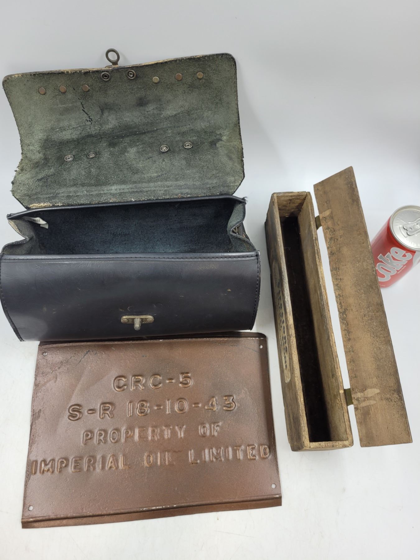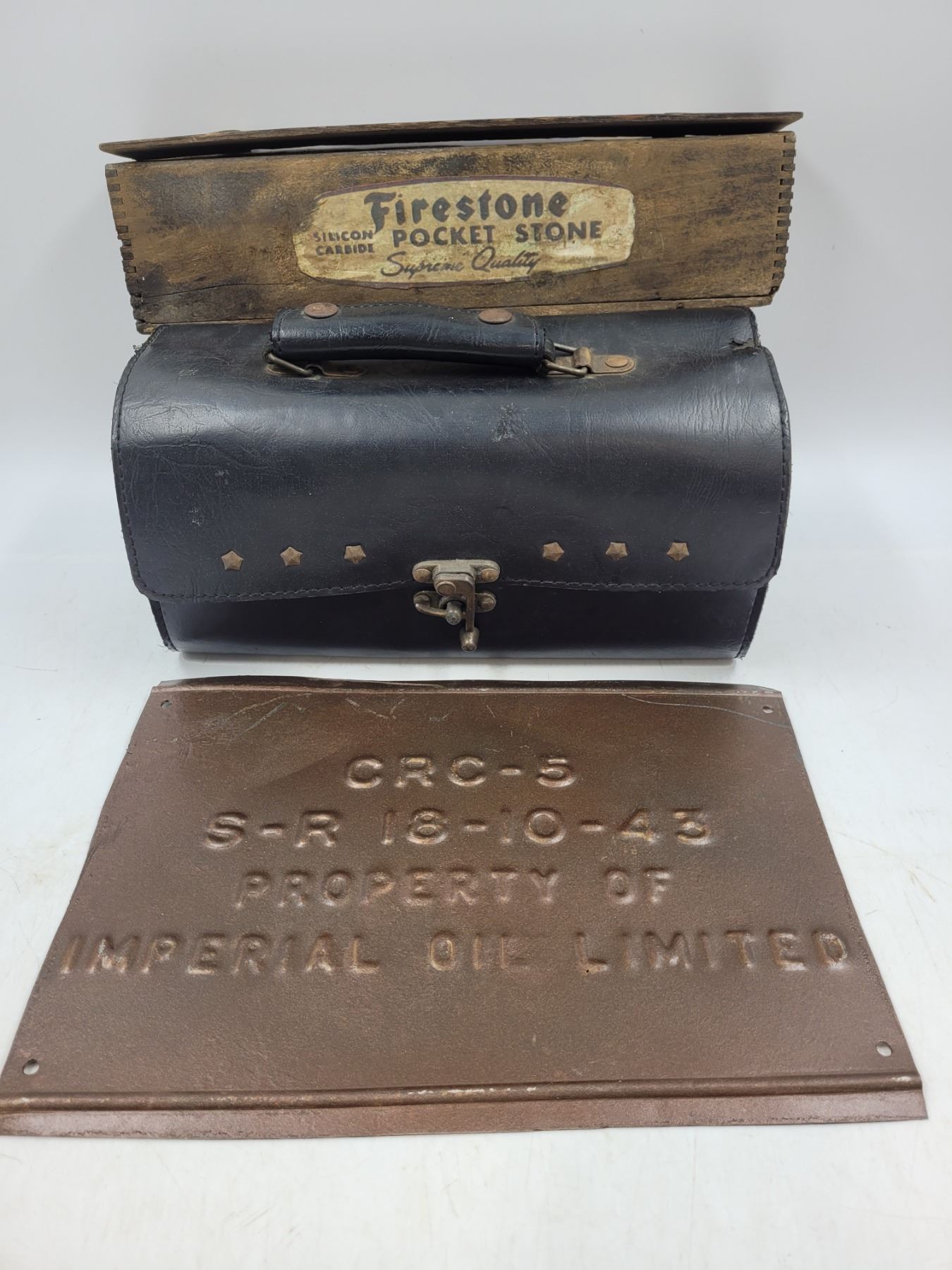 Imperial Oil Plaque Wooden Firestone Box and Leather Bag