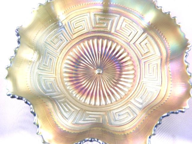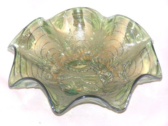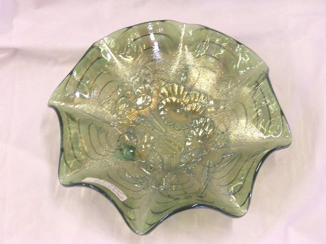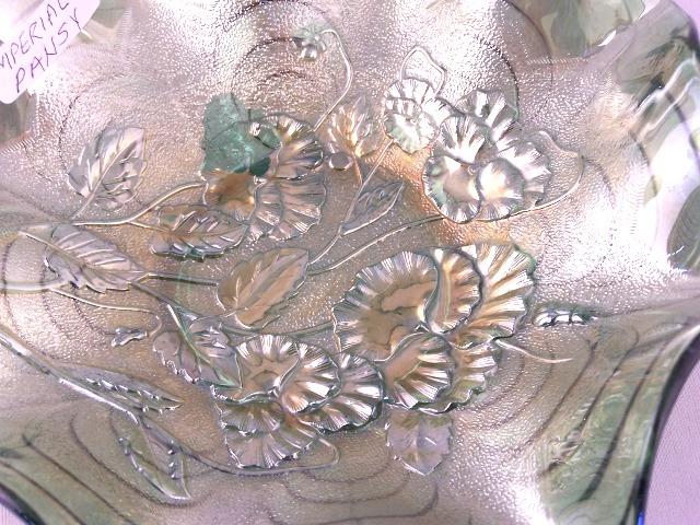 Another great Imperial green art glass bowl with a Pansy pattern interior. Approx 9" x 2.5". Condition is good.