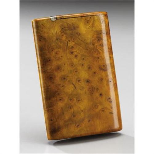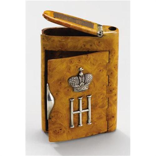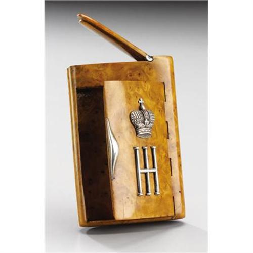 <B>Russian Karelian Birchwood Imperial Presentation Cigarette Case</B></I><BR><I>Circa 1890 </B></I><BR><BR>The cover applied with the conjoined Cyrillic initials of Grand Duke Nikolai Nikolaevich (grandson of Emperor Nicholas I), below a Romanov crown in silver, with spine to accommodate a tinder cord (missing), the top with hinged match compartment and exterior match strike-<BR>3 3/4 x 2 5/8 in. <BR><I><BR>He was the most admired man in the army, not only an old fashioned soldier, but deeply Slav. His whole being exuded a fierce energy. His incisive measured speed, flashing eyes and quick, nervous movements, hard, steel-trap mouth and gigantic stature personify imperious and impetuous audacity. - </B></I>Maurice Paléologue. <BR><BR>Grand Duke Nikolai Nikolaevich (1856-1929) was the uncle of Tsar Nicholas II and Commander-in-Chief of the Russian Army at the outbreak of World War I. He began his career as young officer during the Turkish War (1877-78), where he was awarded a Saint George's Cross. He went on to command a Guards Hussar Regiment and eventually the entire Imperial Guard. After the Revolution, the Grand Duke went on to the Crimea, although he was not involved in the Civil War. In 1919 the British Navy evacuated him on the <I>H.M.S. Nelson</B></I> along with the Dowager Empress, Maria Fedorovna. <BR><BR>Provenance:<BR>Purchased from Sheldon Shapiro, London<BR><BR><b>Shipping:</b> Requires 3rd Party Shipping (<a target="_blank" href="http://www.heritageauctions.com/common/shipping.php">view shipping information</a>)